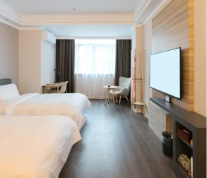 Varied types of rooms, from standard to luxury suites, equipped with essentials like beds.